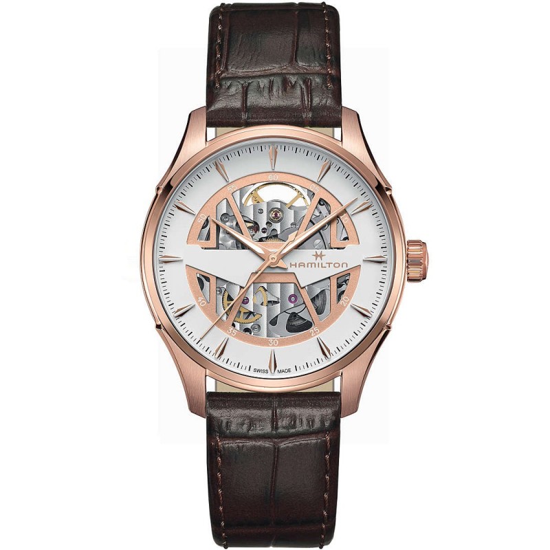 Hamilton men's automatic watch from the Jazzmaster collection. Model: Skeleton. Watch With Automatic Movement And Caliber H-10-S. The Power Reserve Is 80H And Minimum Of 75H .. The Case Is Made Of Stainless Steel With Rose Finish And Size Of 40.00 Mm And Thickness Of 11.05. The Crown Is Standard .. The Water Resistance Is 5 Bar. The Glass Is Made With Single Coated Sapphire. The dial is white. The Strap Is Made Of Leather With Brown Cow Design The Closure Is A Pin Buckle. The Width Of The Loop Is 20.00 Mm ..