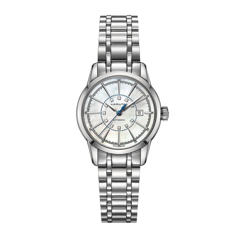 Hamilton women's wristwatch from the American Classic collection with automatic ETA 2681 movement, 43-hour power reserve, and time-only function with date. Round silver-tone stainless steel case, 32 mm in diameter and 11.3 mm thick, with a transparent case back. Analog mother-of-pearl dial embellished with diamonds, silver-tone stick indexes, date display at 3 o'clock, logo at the top, and anti-reflective sapphire crystal. Silver-tone stainless steel strap with deployant clasp, water resistance 5 ATM: splash-proof but not pressurized.
