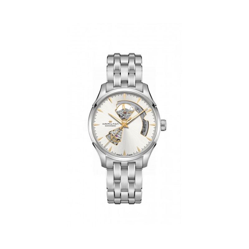 Hamilton men's wristwatch from the Jazzmaster collection with an exposed Swiss automatic Caliber H-10 movement, 80-hour power reserve, and a time-only function. Round, silver-tone stainless steel case measuring 40 mm in diameter and 11.1 mm thick, with a stainless steel case back and snap-on crown. White analog dial with exposed movement, gold-tone stick indexes, logo on the left side, and sapphire crystal with anti-reflective coating. Silver-tone stainless steel strap with a push-button deployment clasp. Water resistance to 5 ATM: splashes of water, but not pressurized.