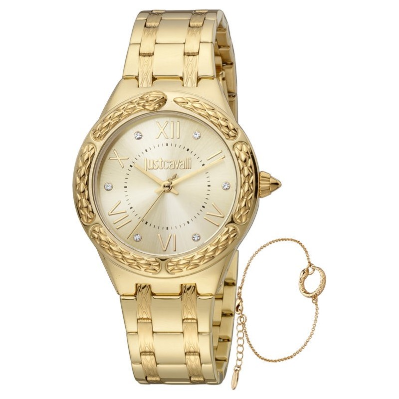 Just Cavalli Time Set fashion wristwatches JC1L200M0055 analog woman with quartz movement, 35 mm diameter stainless steel case, gold dial, mineral glass and stainless steel strap