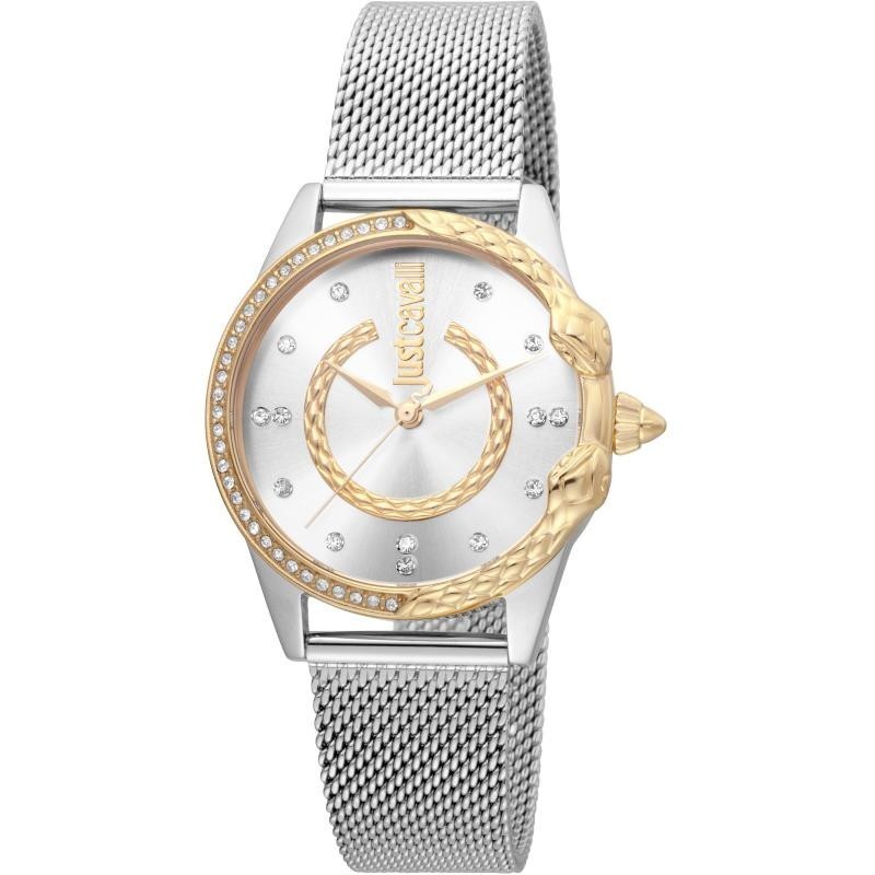 Just Cavalli women's wristwatch from the Animalier collection with quartz movement and time-only function. Round, silver-tone stainless steel case, 32 mm in diameter and 10 mm thick, gold-tone steel bezel embellished with a half-circle of white zirconia and intersecting snake heads. Silver analog dial with stone indexes, gold-tone vertical logo at the top, mineral crystal. Silver-tone stainless steel Milanese mesh strap with sliding flap closure, water resistance 5 ATM: splash-proof but not pressurized.