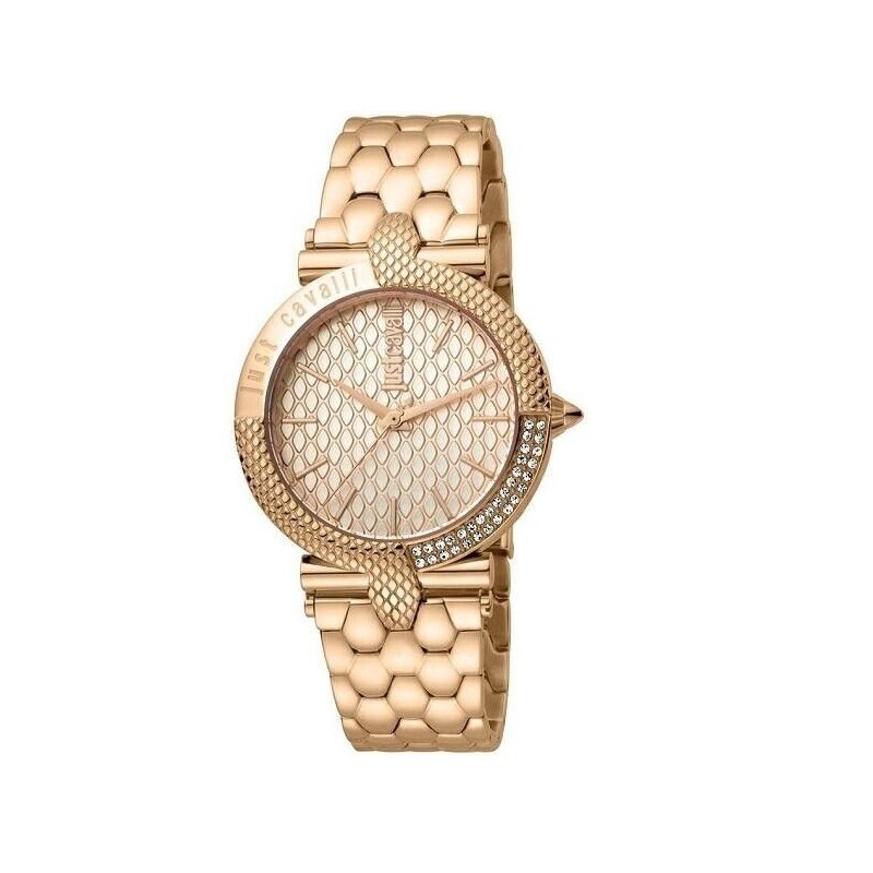 Just Cavalli women's wristwatch from the Animalier collection with quartz movement and time-only function. Round stainless steel case with rose gold IP treatment, 34 mm in diameter and 8 mm thick, rose gold-tone steel bezel embellished with a double half-circle of white zirconia and the logo. Rose gold-tone analog dial with stick indexes, vertical logo at the top, mineral crystal. Stainless steel strap with rose gold IP treatment and push-button deployment clasp, water resistance 5 ATM: splash-proof but not pressurized.