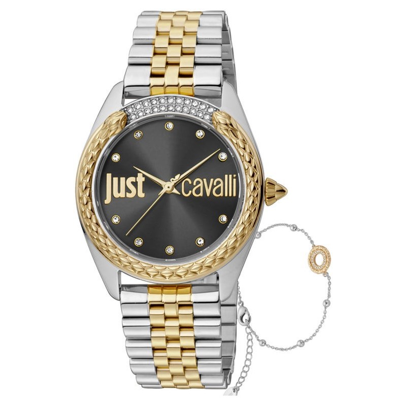 Just Cavalli women's wristwatch from the Animalier collection with quartz movement and time-only function. Round, silver-tone stainless steel case, 34 mm in diameter and 7 mm thick, gold-tone steel bezel embellished with intertwining snakes and white zirconia. Black analog dial with stone indexes, gold-tone horizontal logo in the center of the dial, scratch-resistant mineral crystal. Two-tone silver and gold stainless steel strap with push-button deployment clasp, water resistance 5 ATM: splash-proof, but not pressurized.