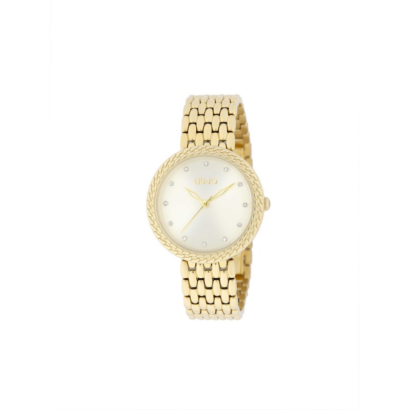 Liu Jo Women's Only Time Clock From the Circle Chain Collection. Watch With 34 Mm Diameter Ip Gold Stainless Steel Case And Champagne Dial. Ip Gold Color Stainless Steel Strap. Glass: Mineral, Stones: On the Indexes. The All'Acqua Resistance Is 3 Atm And The Movement Is Miyota Cal. Vj21.