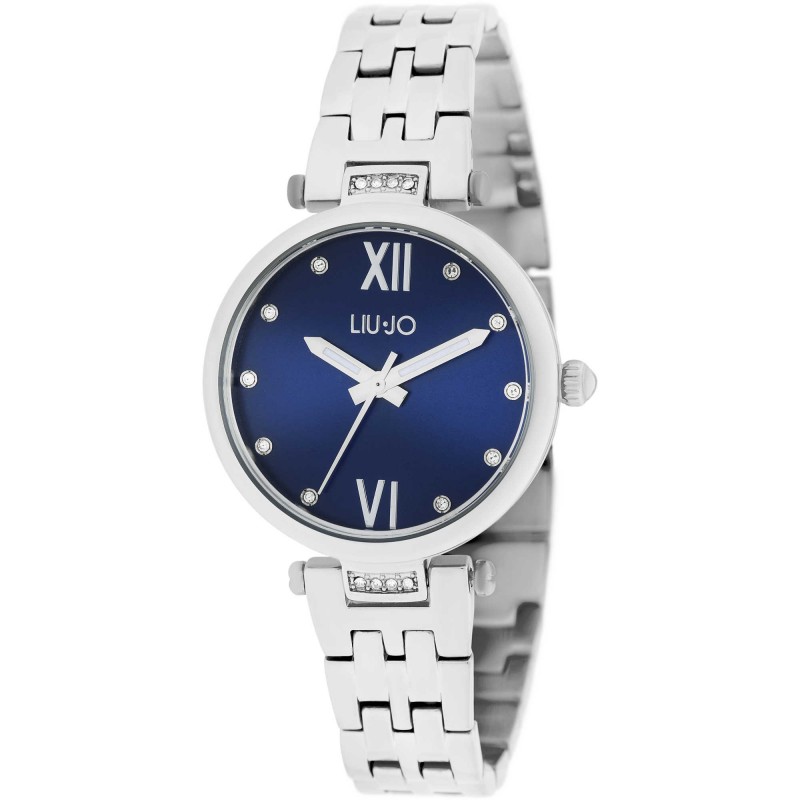 Liu Jo women's time only watch from the Elizabeth collection Time only watch with 31mm steel case in silver-blue color with stones, round blue analogue dial with stone indexes and Roman numerals only time function, mineral glass. The strap is made of silver-colored steel with deployant clasp. The movement is quartz type Miyota 2035. The water resistance is 3 atmospheres.