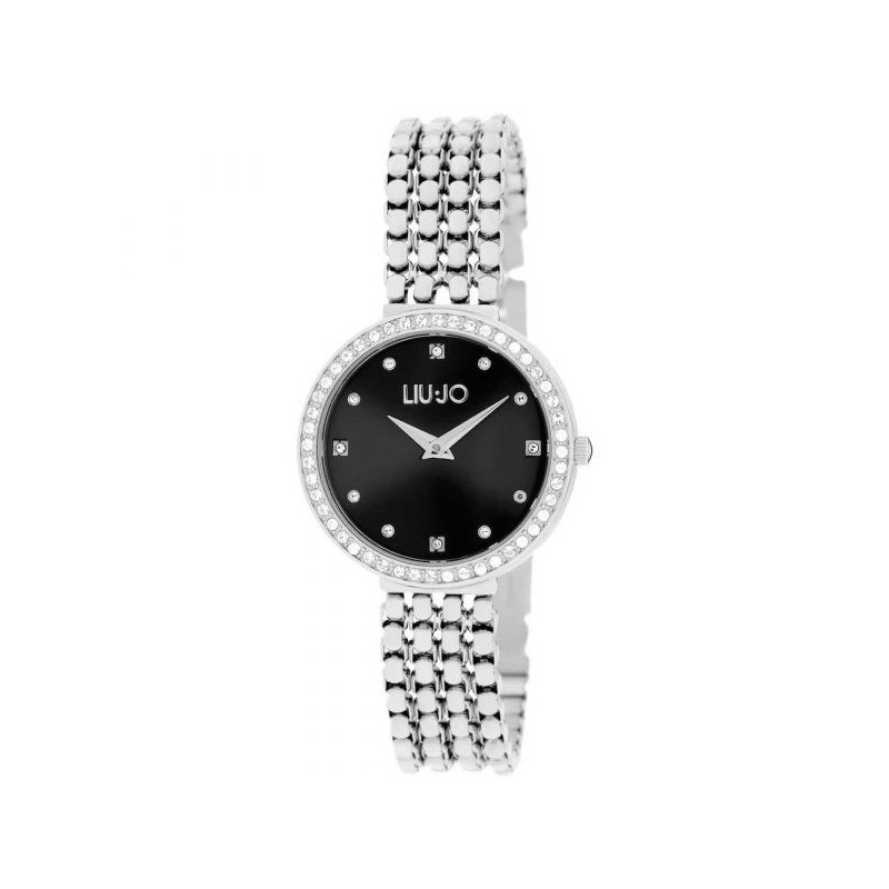 Liu Jo women's wristwatch from the Chains Clear collection with Miyota Cal quartz movement. VJ20 and time only function. 28 mm diameter silver-tone stainless steel case with white crystal outline, black analog dial with stone indexes, mineral glass. Silver-tone mesh stainless steel bracelet with folding clasp, 3 ATM water resistant: resistant to splashes of water but not under pressure.