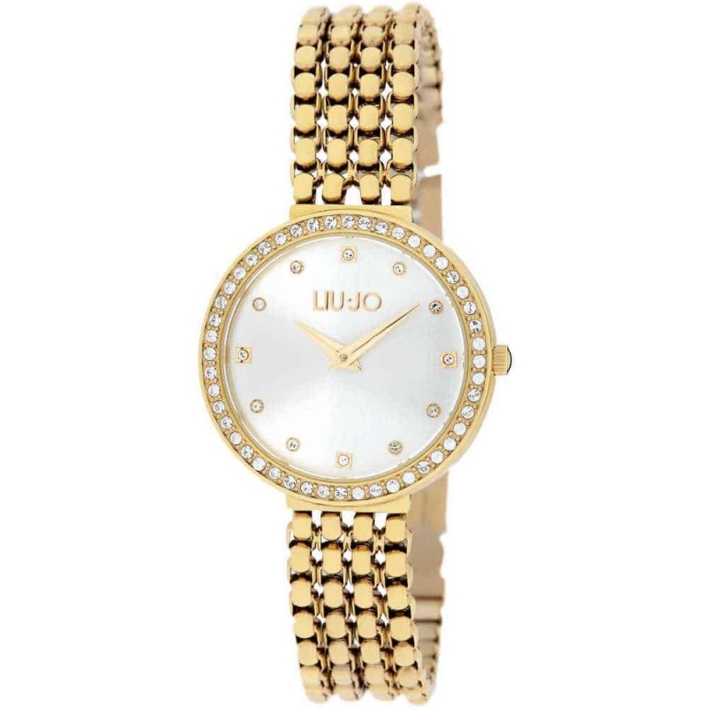Liu Jo women's wristwatch from the Chains Clear collection with quartz movement and time only function. Gold-colored stainless steel case with crystal outline of 28mm diameter, silver analog dial with stone indexes, mineral glass. Gold-tone stainless steel mesh bracelet with folding clasp, 3 ATM water resistant: resistant to splashes of water but not under pressure.