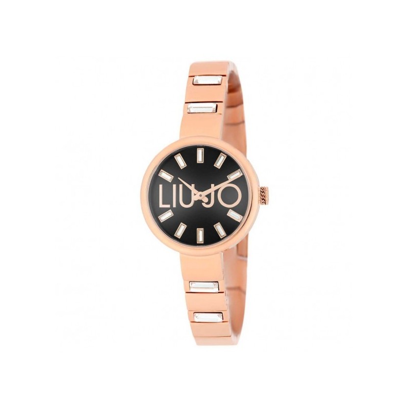 Liu Jo women's time only wristwatch from the Luxurious collection. with miyota quartz movement cal. y120. Rose gold colored stainless steel case with a diameter of 29mm, black analog dial with white crystals at the baguette cut indexes, mineral glass. Rose gold-tone stainless steel bracelet with applied white baguette-cut crystals and folding clasp, 5 ATM water resistant: resistant to splashes of water but not under pressure