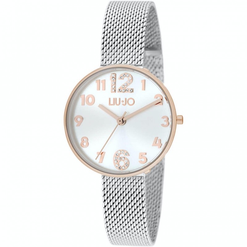 Women's time only wristwatch from the Complicity 2.0 Collection by Liu Jo with Miyota quartz movement cal. 2036. 31mm diameter rose gold colored stainless steel case, white analogue dial with rose gold colored Arabic numeral hour markers and crystals on the 12 and 6 numbers, logo on the top, mineral glass. Silver colored stainless steel milan mesh bracelet with folding clasp, 3 ATM water resistant: resistant to splashes of water but not under pressure.
