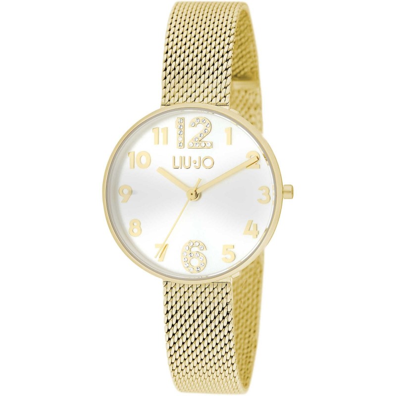 Women's time only wristwatch from the Complicity 2.0 Collection by Liu Jo with Miyota quartz movement cal. 2036. 31mm diameter gold-tone stainless steel case, white analog dial with gold-tone Arabic numeral hour markers and crystals at 12 and 6, logo on top, mineral glass. Gold-tone stainless steel milano mesh bracelet with folding clasp, 3 ATM water resistant: resistant to splashes of water but not under pressure