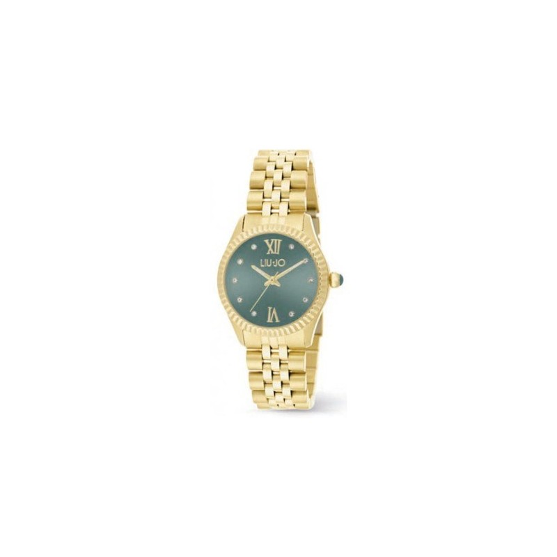 Liu Jo women's wristwatch from the Tiny collection with quartz movement and time-only function. 30mm gold-tone stainless steel case, knurled bezel, green analog dial with gemstone indexes and Roman numerals, mineral crystal. Gold-tone stainless steel Jubilee mesh strap with deployant clasp, water resistance 5 ATM: splash-proof but not pressurized.
