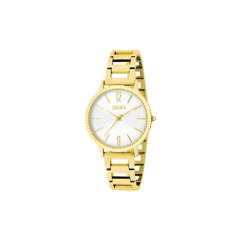 Liu Jo women's wristwatch from the Biphasic collection with three-hand quartz movement and time-only function. Round-shaped stainless steel case with gold IP treatment with a diameter of 34 mm, knurled gold-colored steel bezel, silver analogue dial with gold-colored stick indexes and Arabic numerals only at the 12 and 6 positions, logo on the top, mineral glass . Gold IP stainless steel bracelet strap with clip closure, 3 ATM water resistant: resistant to splashes of water but not under pressure.