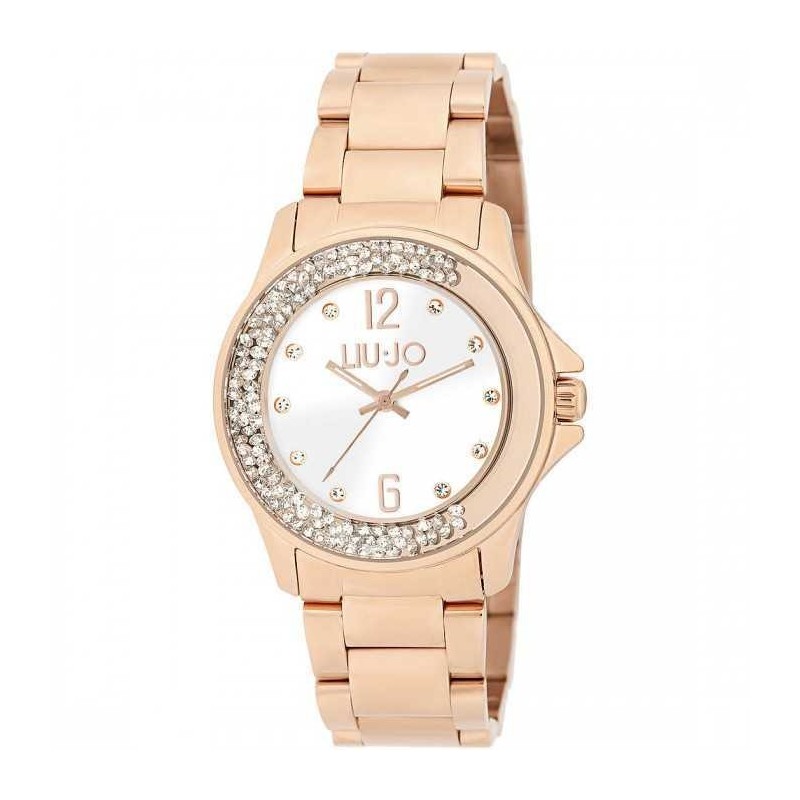Liu Jo women's wristwatch from the Dancing collection with three-hand quartz movement and time-only function. Round-shaped stainless steel case with rose gold IP treatment with a diameter of 37 mm, analogue silver dial embellished with a ring of white crystals placed inside the dial that move with the movement of the wrist, indexes in gold-coloured stones and Arabic numerals pink only at the 12 and 6 o'clock positions, logo on the top, mineral glass. Rose gold IP stainless steel strap with deployant clasp with side buttons, 5 ATM water resistant: resistant to splashes of water but not under pressure.