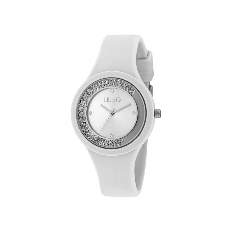 Liu Jo women's wristwatch from the Dancing Sport collection with Seiko PC21 quartz movement and time-only functions. Round-shaped stainless steel case integrated in round-shaped white silicone with a diameter of 38 mm, bright white silver analogue dial surrounded by loose white crystals in the bezel, 4 stone indexes, logo on the top, mineral glass. White silicone strap with pin buckle closure, 3 ATM water resistant: resistant to splashes of water but not under pressure.