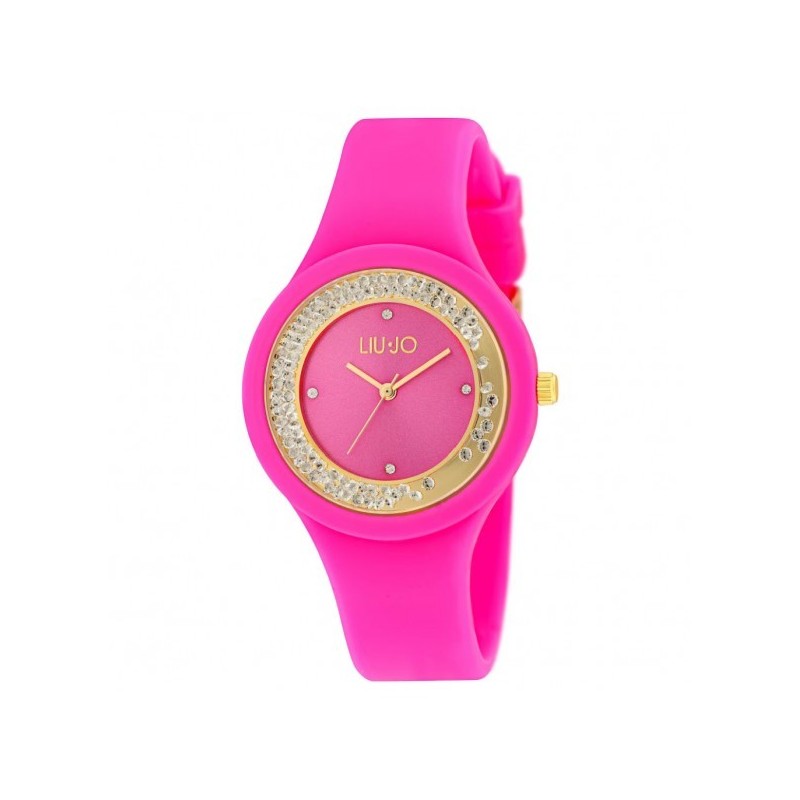 Liu Jo women's wristwatch from the Dancing Sport collection with Miyota 2035 quartz movement and time-only functions. Round-shaped stainless steel case integrated in fuchsia silicone with a diameter of 38 mm, fuchsia analogue dial with outline of loose white crystals in a rose gold bezel, 4 stone indexes, logo on the top, mineral glass. Fuchsia silicone strap with pin buckle closure, 3 ATM water resistant: resistant to splashes of water but not under pressure.