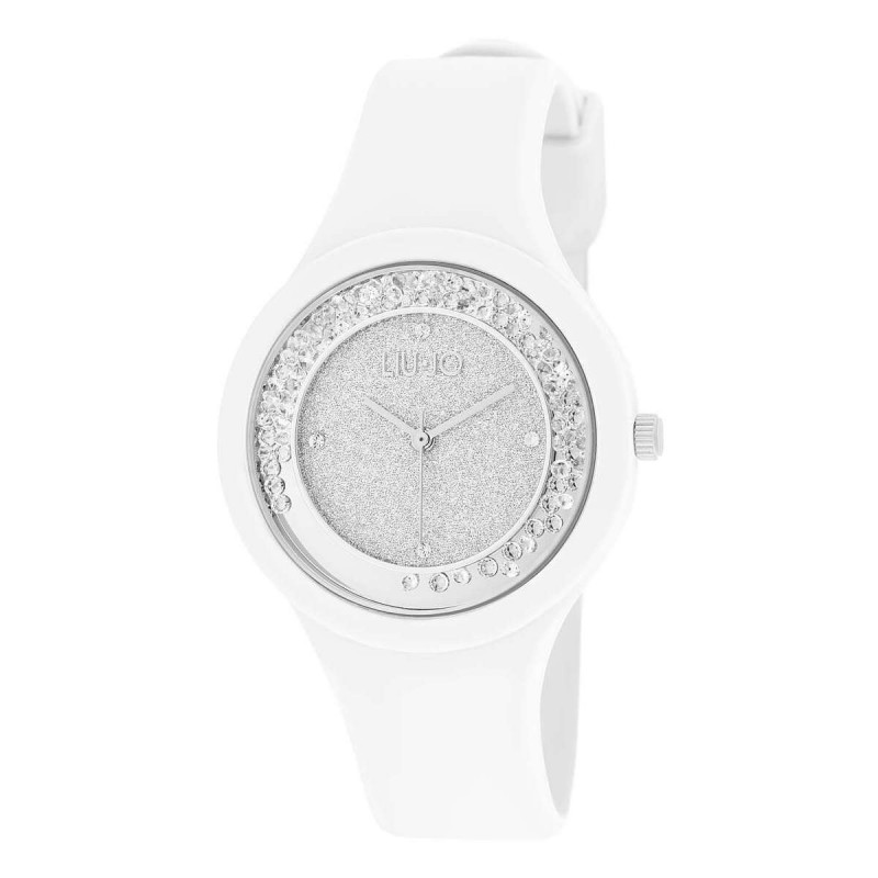 Liu Jo women's wristwatch from the Dancing Sport Glitter collection with quartz movement and time-only function. Round-shaped silver-colored stainless steel case embedded in silicone, 36 mm diameter, glittery analogue dial with white loose crystals in the bezel, four stone indexes, logo on the top, mineral glass. White silicone strap with pin buckle closure, 5 ATM water resistant: resistant to splashes of water but not under pressure.