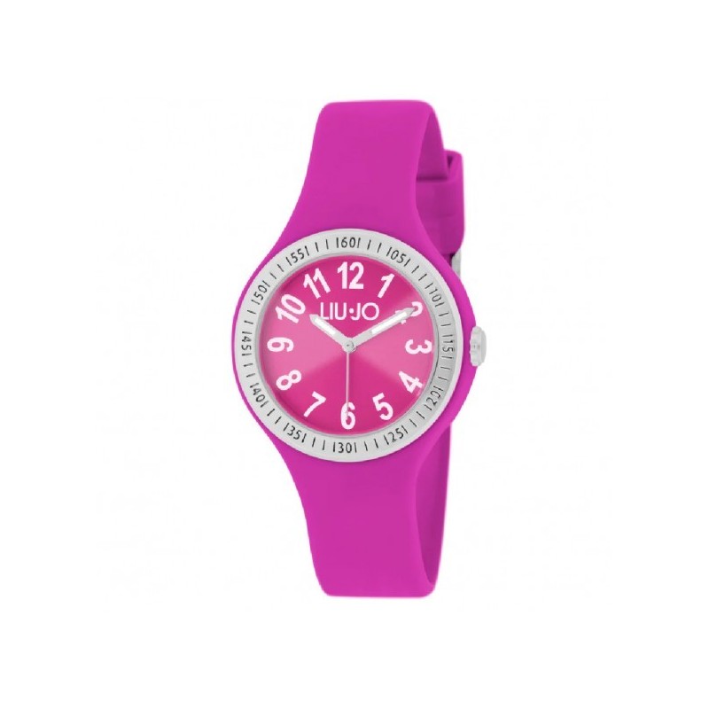 Liu Jo women's wristwatch from the Teen Friendly collection with Miyota 2035 quartz movement and time-only functions. Round silver-tone stainless steel case encased in purple silicone, 33.5 mm in diameter. Analog dial with Arabic numeral indexes, logo at the top, mineral crystal. Purple silicone strap with pin buckle closure, water resistance 3 ATM: splash-proof but not pressurized.