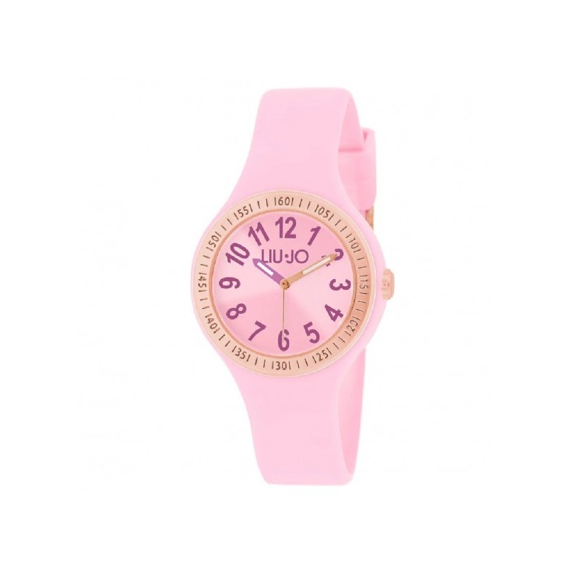 Liu Jo women's wristwatch from the Teen Friendly collection with Miyota 2035 quartz movement and time-only functions. Round rose gold-tone stainless steel case encased in pink silicone, 33 mm in diameter. Rose gold-plated steel bezel with minute track. Light blue analog dial with purple Arabic numerals, logo at the top, mineral crystal. Pink silicone strap with pin buckle closure, water resistance 3 ATM: splash-proof but not pressurized.
