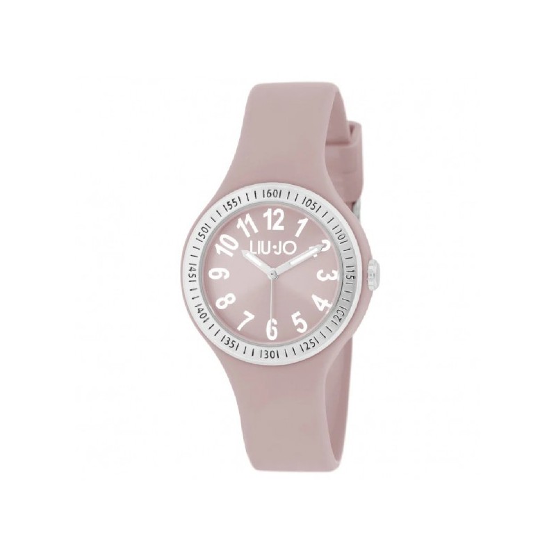 Liu Jo women's wristwatch from the Teen Friendly collection with Miyota 2035 quartz movement and time-only functions. Round silver-tone stainless steel case encased in dove gray silicone, 33.5 mm in diameter. Stainless steel bezel with minute track. Gray analog dial with Arabic numeral indexes, logo at the top, mineral crystal. Dove gray silicone strap with pin buckle closure, water resistance 3 ATM: splash-proof but not pressurized.