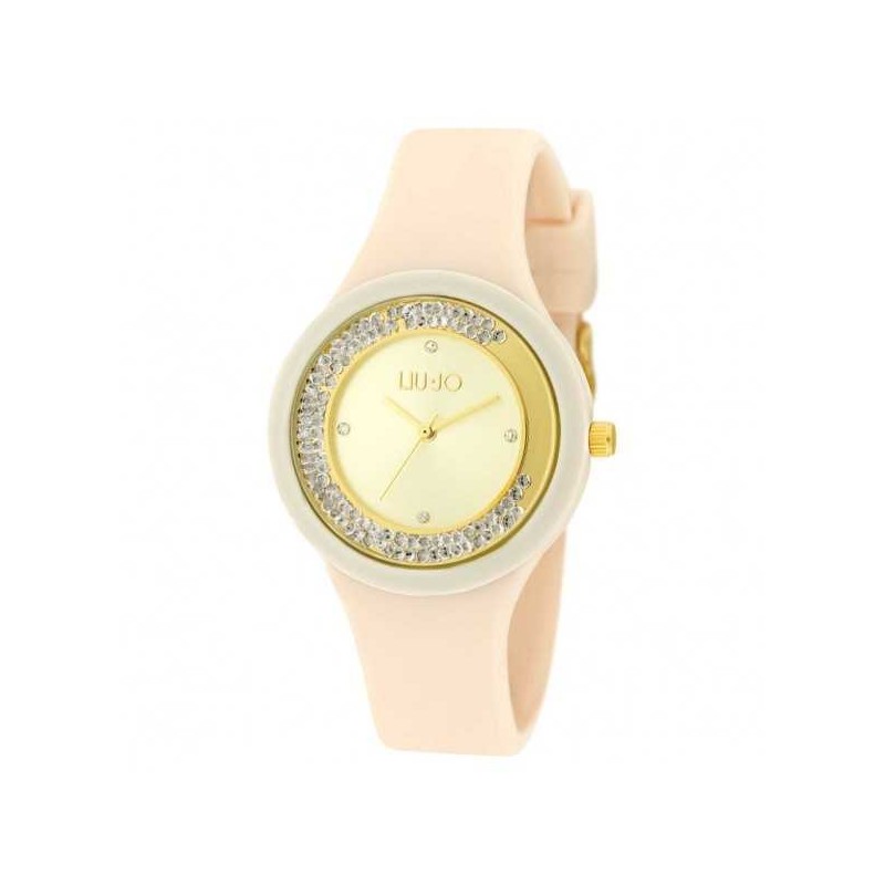 Liu Jo women's wristwatch from the Dancing Sport collection with Miyota 2035 quartz movement and time-only functions. Round, gold-tone stainless steel case encased in pink silicone, 36 mm in diameter. Pink analog dial with gold trim and embellished with moving white crystals that follow the movement of the wrist, stone indexes, logo on the top, mineral glass. Pink silicone strap with pin buckle closure, water resistance 3 ATM: resistant to splashes of water but not pressurized.