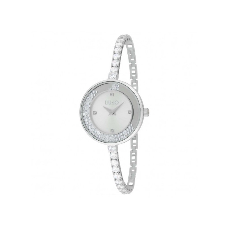 Liu Jo Milano women's wristwatch from the Dancing Gala collection with Miyota VJ20 quartz movement and time-only functions. Round, silver-tone stainless steel case measuring 29mm in diameter. The bezel is embellished with loose white crystals that follow the movement of the wrist. Silver analog dial with four stone indexes and logo at the top, mineral glass. Tennis strap with white Swarovski crystals. Safety clasp with removable links, water resistance 3 ATM: resistant to splashes of water but not pressurized.