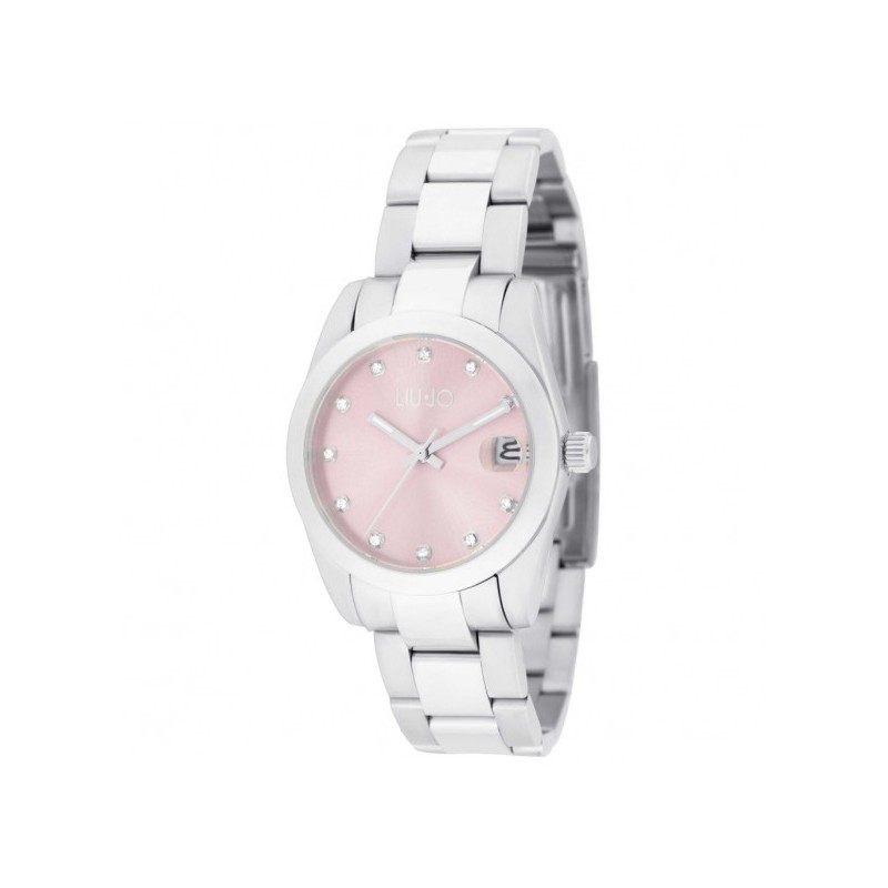 Liu Jo women's wristwatch from the Juniper collection with Miyota 2315 quartz movement and time-only functions with date. Round, silver-tone stainless steel case, 34 mm in diameter. Pink analog dial with jeweled indexes, date display at 3 o'clock with magnifying glass, logo at the top, mineral crystal. Silver-tone stainless steel strap with push-button deployment clasp, water resistance 5 ATM: splash-proof, but not pressurized.