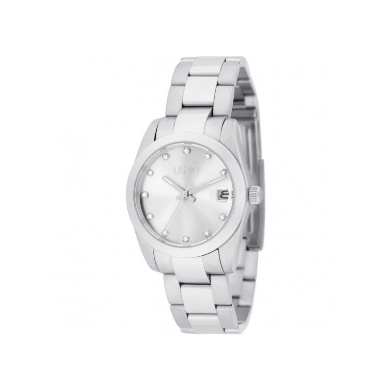Liu Jo women's wristwatch from the Juniper collection with Miyota 2315 quartz movement and time-only functions with date. Round, silver-tone stainless steel case with a diameter of 34 mm. Silver analog dial with gemstone hour markers, date display at 3 o'clock with a magnifying lens, logo at the top, mineral crystal. Silver-tone stainless steel strap with push-button deployment clasp, water resistance 5 ATM: splash-proof but not pressurized.