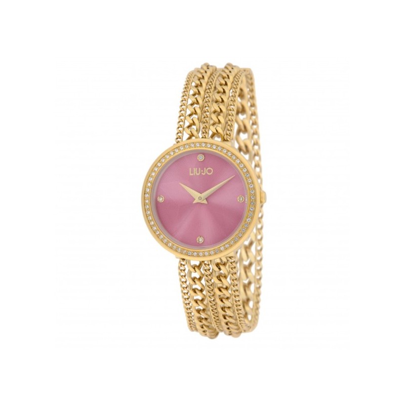 Liu Jo women's wristwatch from the Chains collection with Miyota VJ20 quartz movement and time-only function. Round, gold-tone stainless steel case, 32 mm in diameter, gold-tone bezel embellished with white crystals. Pink analog dial with four stone indexes, logo at the top, mineral crystal. Gold-tone bracelet strap adjustable by removing links with a hidden clasp, water resistant to 3 ATM: splashes of water, but not pressurized.