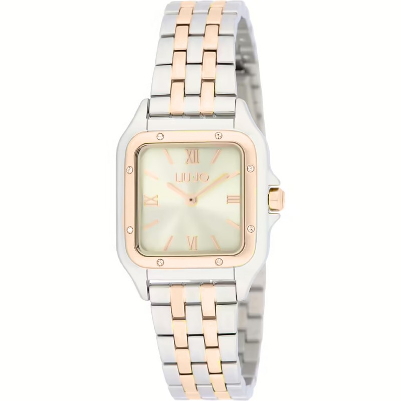 Liu Jo women's wristwatch from the Shimler collection with quartz movement and time-only function. Square, silver-tone stainless steel case, 28 mm in diameter, rose gold-tone steel bezel embellished with white crystals. White analog dial with mixed baton and Roman numeral indexes, logo at the top, mineral crystal. Two-tone silver and rose gold stainless steel strap with push-button deployment clasp, water resistance 3 ATM: splash-proof but not pressurized.