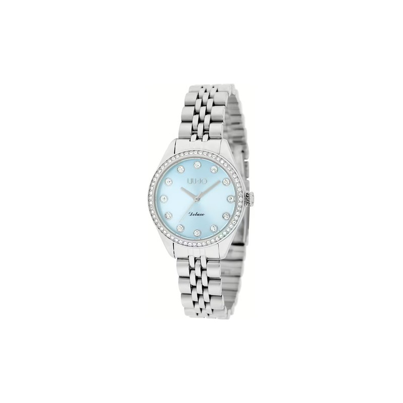 Liu Jo women's wristwatch from the Deluxe collection with quartz movement and time-only function. Round, silver-tone stainless steel case, 30 mm in diameter, bezel embellished with white crystals. Light blue analog dial with white crystal hour markers, logo at the top, mineral glass. Silver-tone stainless steel strap with push-button deployment clasp, water resistance 5 ATM: splash-proof, but not pressurized.