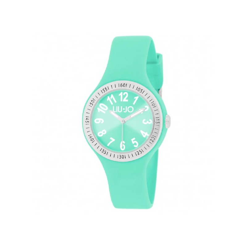 Liu Jo women's wristwatch from the Teen Friendly collection with Miyota 2035 quartz movement and time-only functions. Round, aquamarine silicone case with a diameter of 33.5 mm and a stainless steel bezel with a minute track. Aquamarine analog dial with Arabic numeral indexes, logo at the top, and mineral crystal. Aquamarine silicone strap with a pin buckle closure. Water resistant to 3 ATM: splashes of water, but not pressurized.