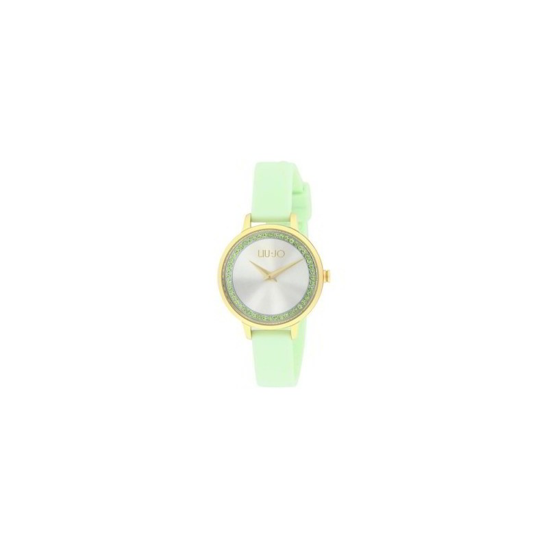 Liu Jo women's wristwatch from the Shine collection with quartz movement and time-only function. Round rose gold-tone stainless steel case, 32 mm in diameter, bezel embellished with green crystals. Silver analog dial without indices, logo at the top, mineral crystal. Green silicone strap with pin buckle closure, water resistance 3 ATM: splash-proof but not pressurized.