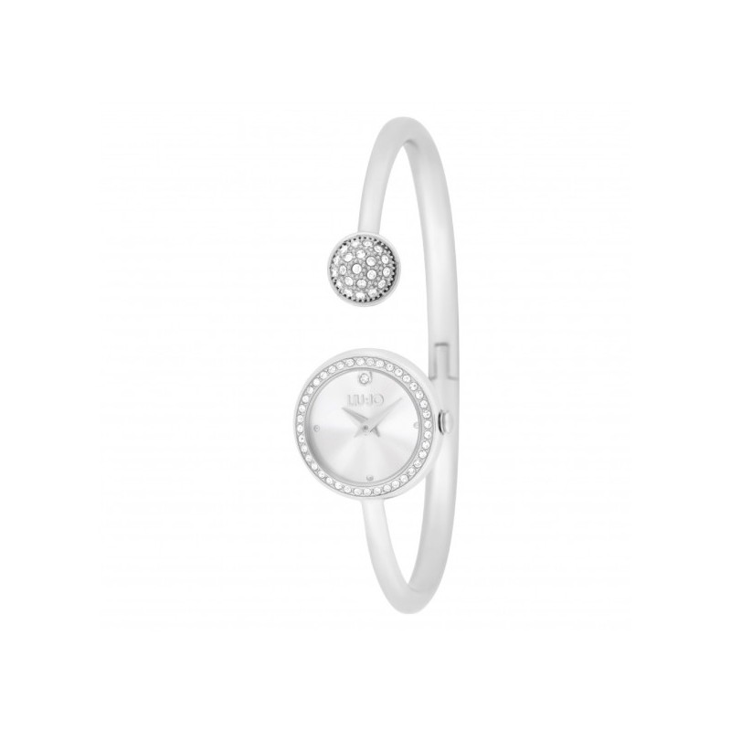 Liu Jo women's jewelry wristwatch from the Dècor collection with Seiko VJ20 quartz movement and time-only functions. Round silver-tone stainless steel case, 20 mm in diameter, bezel embellished with white crystals. Silver analog dial with crystal indexes, logo at the top, mineral glass. Silver-tone rigid bracelet strap with white stone pavé, water resistance 5 ATM: splash-proof but not pressurized.