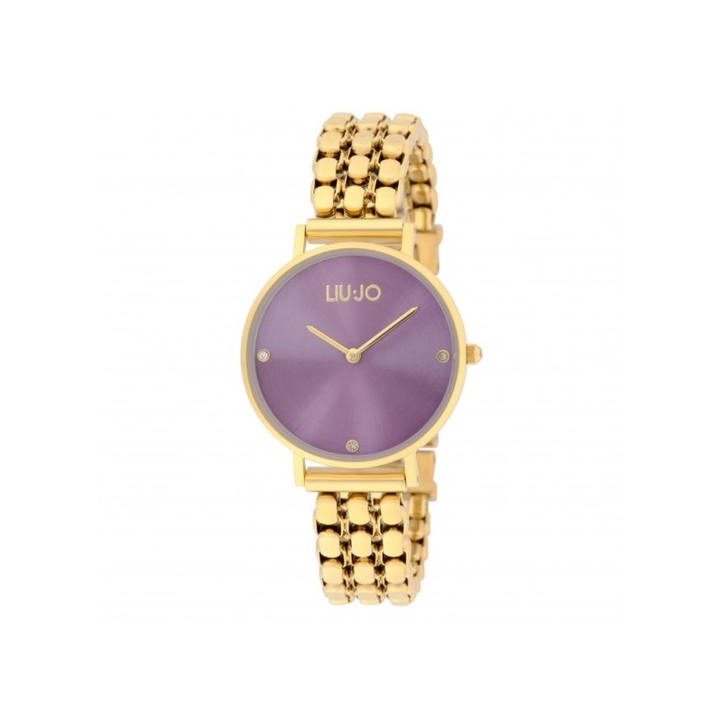 Liu Jo women's wristwatch from the Framework collection with Miyota VJ20 quartz movement and time-only functions. Round, gold-tone stainless steel case measuring 32 mm in diameter. Purple analog dial with three zirconia indices, logo at the top, mineral crystal. Adjustable, gold-tone stainless steel bracelet with removable links. Water resistant to 3 ATM: splashes of water, but not pressurized.