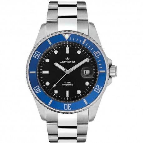 Lorenz Men's Watch from the Geneva Collection Automatic Diver 100 meters 026959EE. A sports wristwatch with automatic movement. 42 mm steel case. Unidirectional rotating knurled ring in blue color. Mineral glass with zoom on the date. Black dial with indexes and hands treated with luminos. Date window at three o'clock. Screw-down crown with mechanical winding. Screw-down steel caseback. This Lorenz men's watch has a sturdy steel strap with a folding clasp. Water resistant 10 ATM therefore waterproof up to 100 meters.