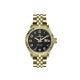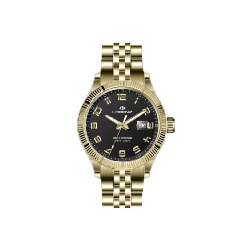 Lorenz men's watch 'Ginevra Number' collection with golden steel jubilee link bracelet with deployant buckle closure, 41 mm gold-colored steel case, steel screw bottom, knurled bezel and crown, black analogue dial with Arabic numerals gold-colored date function, mineral glass. Quartz movement. 5 ATM water resistance