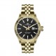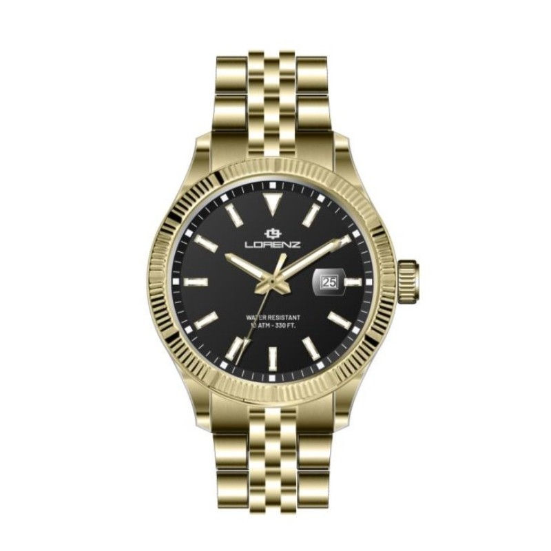 Casual Lorenz Ginevra 26981HH analog men's wristwatch with Miyota GL10-3 time-only quartz movement. 42 mm IP gold steel case. Knurled ring. Screw-down caseback. Pressure crown. Sapphire crystal with date lens. Black dial with stick indexes. IP gold steel bracelet with jubilee link and deployant clasp. Water resistant up to 50 meters.