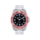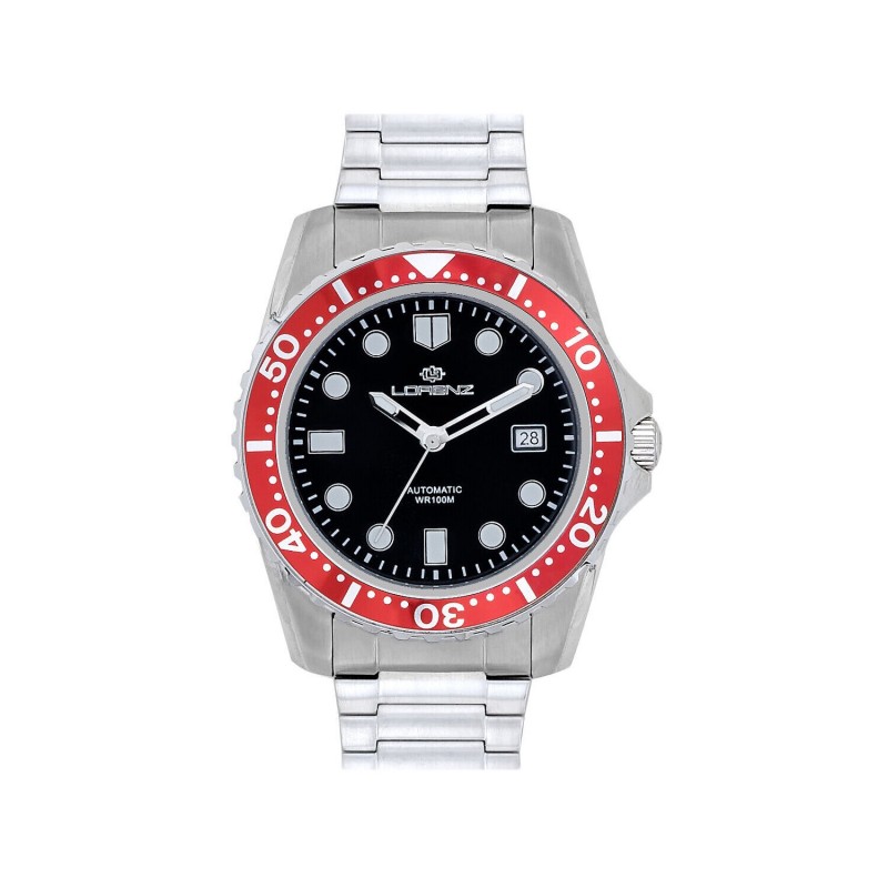 Lorenz men's wristwatch with automatic movement and time only function with date. 42mm diameter silver-colored stainless steel case, screw-down steel bottom, steel bezel with red-colored minutes with white numbers, black analog dial with geometric indexes, date at 3 o'clock, logo on the top, scratch-resistant mineral glass. Silver-tone stainless steel bracelet with deployant clasp, 10 ATM water resistant.