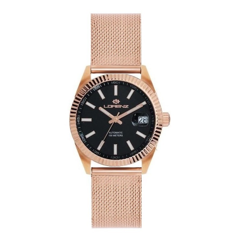 Lorenz men's wristwatch from the "Automatic" collection, Ginevra model, with automatic movement and time-only function with date. Round-shaped stainless steel case with rose gold IP treatment, 39 mm diameter, knurled rose gold-colored steel bezel, screw-down crown, black analog dial with stick indexes, date display at 3 o'clock, logo on the top, mineral glass . Stainless steel strap with Milan mesh and rose gold IP treatment and deployant clasp, 10 ATM water resistant.