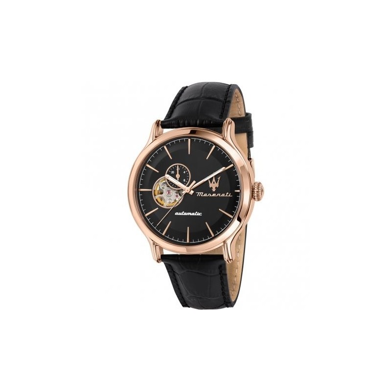 Maserati men's automatic watch Epoca collection ref. R8821118009 . 42 mm rose gold pvd steel case and black leather strap. Black dial with rose gold indexes and spheres, one counter and visible movement. Automatic movement with approximately 40 hour power reserve. Water resistant 10 Atm