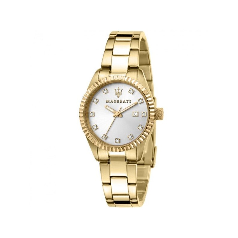 Maserati women's time only wristwatch from the Competizione collection with Miyota 2015 quartz movement. Gold pvd stainless steel case with a diameter of 31mm and a thickness of 9.9mm. knurled bezel, silver analogue dial with white crystal indexes and date at 3 o'clock, mineral glass. Gold pvd stainless steel strap with diver's buckle closure with safety lock. 10 ATM water resistant