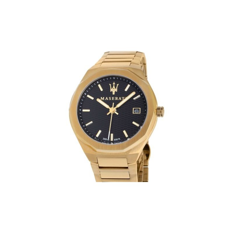 Maserati men's wristwatch from the Stile collection with VJ52 quartz movement and time only function. 42 mm diameter gold-finished stainless steel case, black analog dial with stick indexes, logo at the top and date at 3 o'clock, mineral glass. Gold PVD stainless steel bracelet with push button deployant clasp. 10 ATM water resistant
