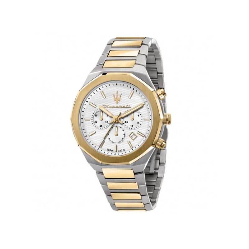 Maserati men's wristwatch from the Stile collection with Miyota JS25 quartz movement and chronograph function with date. 45mm diameter squared stainless steel case with golden bezel and polished finish, white analog dial with gold-colored stick hour markers, logo, hands and details. Date display between 4 and 5 o'clock, mineral glass. Two tone stainless steel bracelet with push button deployment clasp. 10 ATM water resistant.