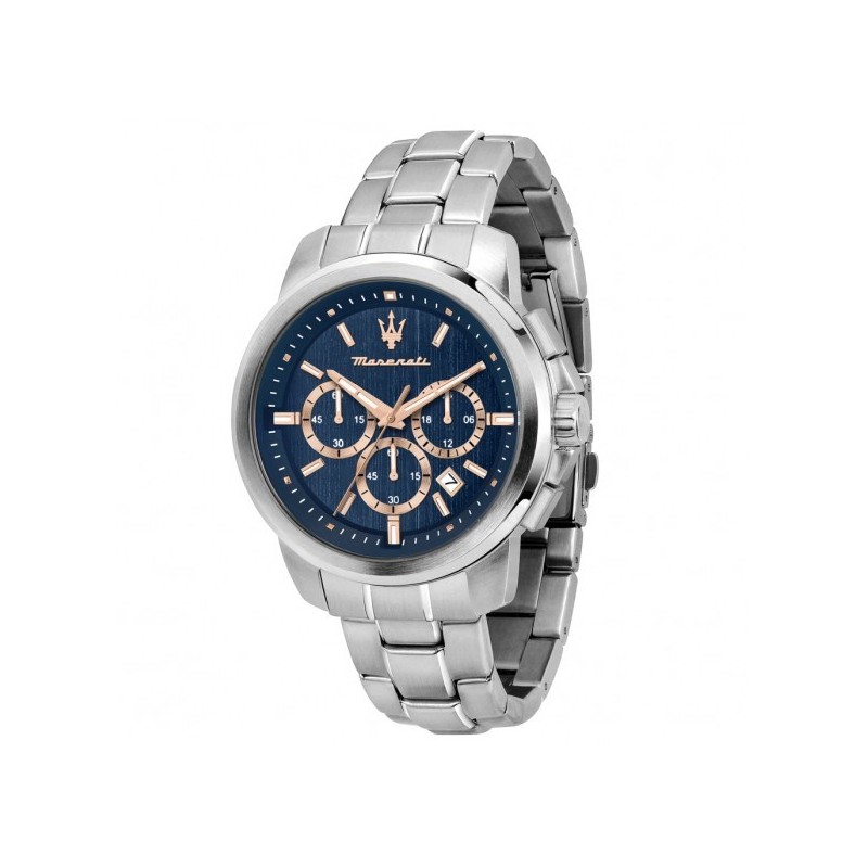 Maserati men's chronograph watch from the Successo collection with quartz movement and chronograph function with date. Silver-colored stainless steel case with polished and satin finish measuring 44mm in diameter and 11.20mm thick, pressure-fit steel caseback, blue analog dial with rose gold baton indexes logo at 12 o'clock and date display between 4 and 5 o'clock , logo on the top, mineral glass. Silver-tone stainless steel strap with push-button deployment clasp, 5 ATM water resistant: splash-proof but not under pressure.