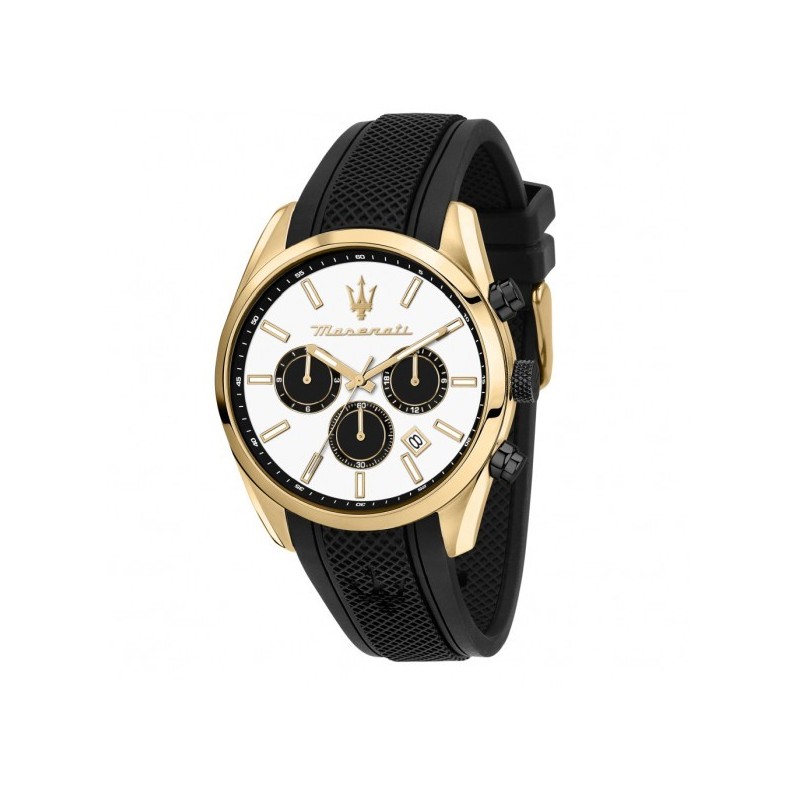 Maserati men's multifunction wristwatch from the Attrazione collection with VD33 quartz movement. Stainless steel case with gold finish measuring 43 mm in diameter and 10.50 mm thick, white analog dial with gold baton indexes, black counters, logo at 12 o'clock and date display between 4 and 5 o'clock, mineral glass. Black silicone strap with pin buckle closure, 5 ATM water resistant: resistant to splashes of water but not under pressure.