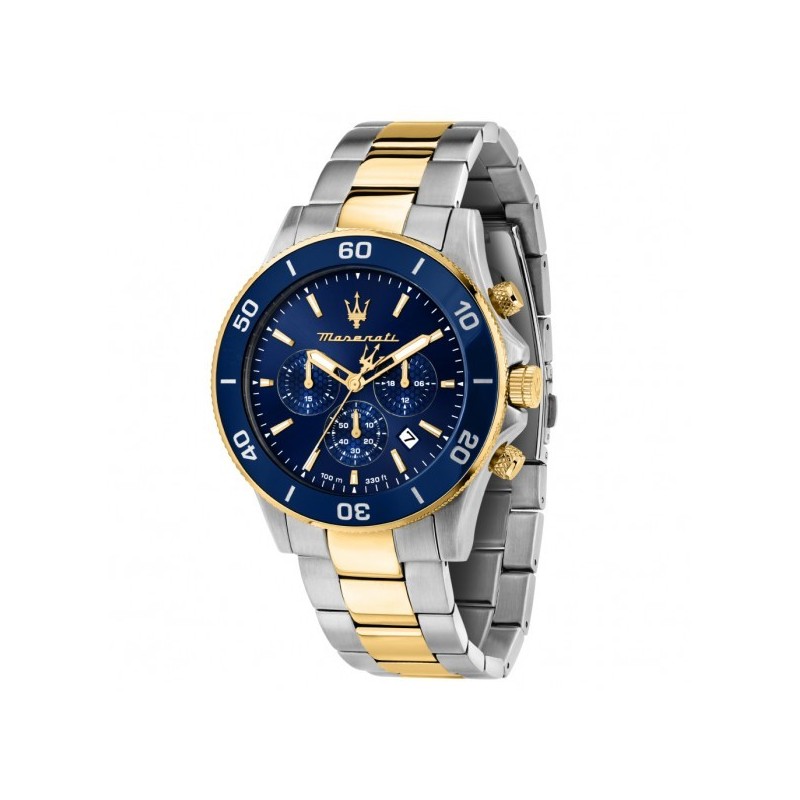 Maserati men's wristwatch from the Competizione collection with Miyota JS25 quartz movement and chronograph functions with date. Round-shaped silver-colored stainless steel case with a diameter of 43 mm and a thickness of 11.20 mm, golden bezel with blue ceramic, screw-down case back and crown to ensure greater waterproofness. Blue analogue dial with baton indexes, logo at 12 o'clock and date window at 3 o'clock with magnifying glass, mineral glass. Two-tone gold and silver stainless steel strap with push-button deployment clasp, 10 ATM water resistant
