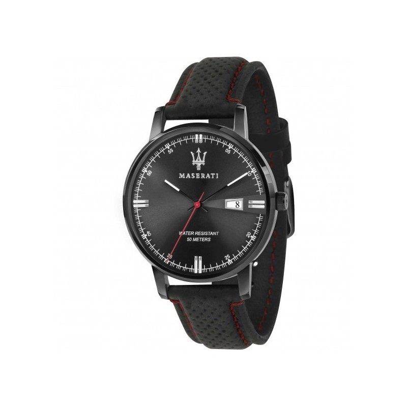 Maserati men's wristwatch from the Eleganza collection with quartz movement and time-only function with date. Round black IP stainless steel case, 42 mm in diameter and 7.60 mm thick. Black analog dial with logo at the top and date display at 3 o'clock, mineral crystal. Black leather strap with red stitching and pin buckle closure, water resistance 5 ATM: splash-proof but not pressurized.