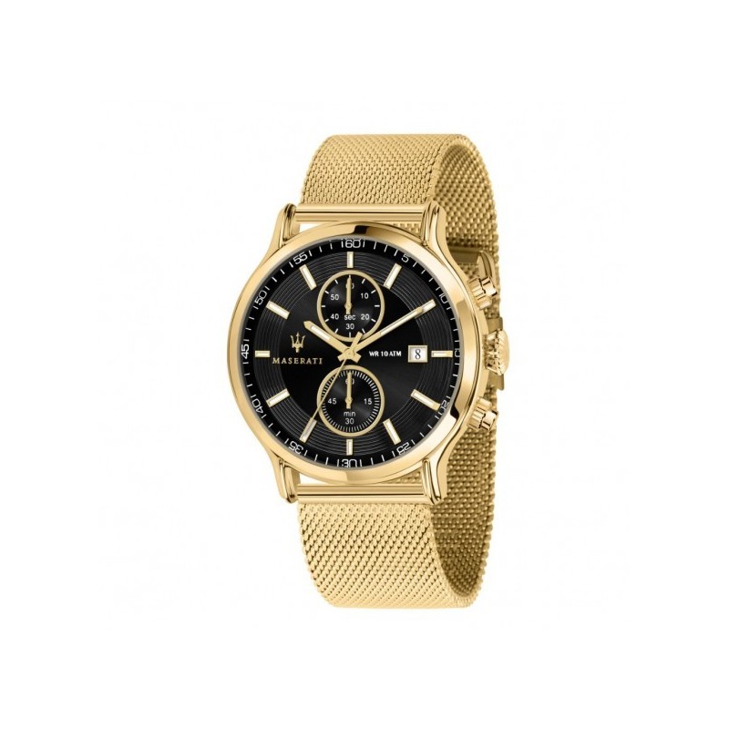 Maserati men's wristwatch from the Epoca collection with TMI VD51B quartz movement and chronograph functions with date. Round stainless steel case with gold finish, 42 mm in diameter and 10.90 mm thick. Black analog dial with stick indexes, date display at 3 o'clock, and logo on the side, mineral crystal.