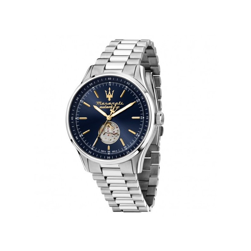 Maserati men's wristwatch from the Sorpasso collection with Miyota 82S0 automatic movement with custom rotor and time-only functions. Round, silver-tone stainless steel case, 42 mm in diameter and 13.2 mm thick. Screw-down case back and crown for increased water resistance.