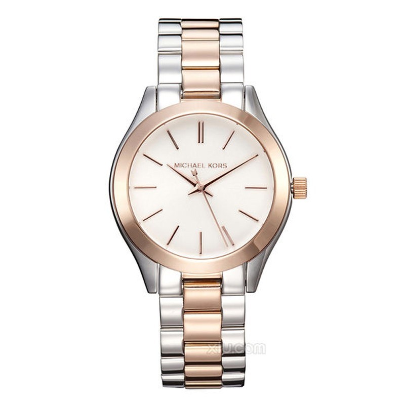 Wristwatch (time only) Michael Kors SLIM RUNWAY woman quartz movement, two-tone pink and silver stainless steel bracelet with snap closure, white dial with rose-colored stick indexes, stainless steel case with 34 mm rose-colored bezel, mineral glass and 5ATM water resistance